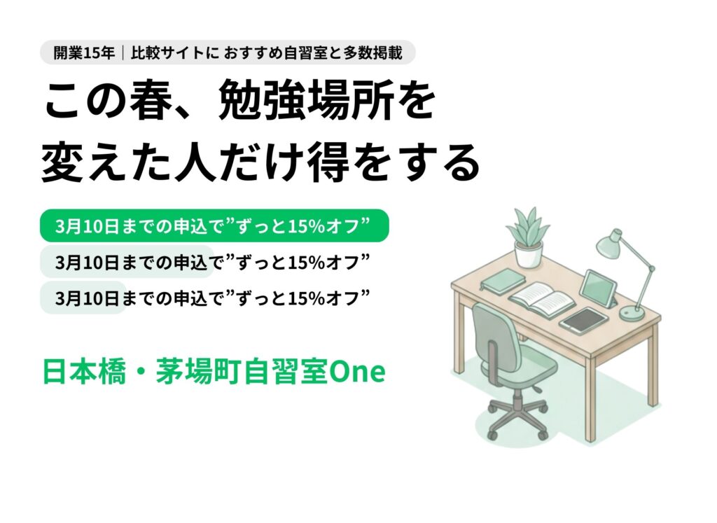 そんな悩みを、日本橋・茅場町 自習室Oneは解決します。